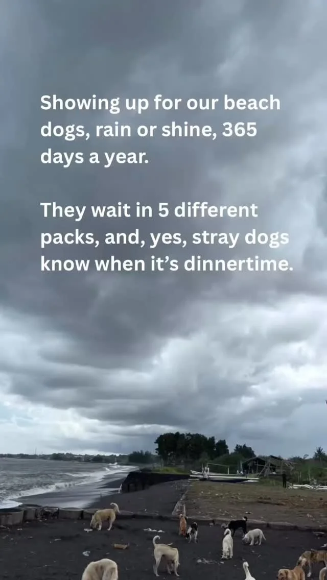 The beach and village that we have adopted are far from the tourist areas of Bali. The dogs here survive by eating from rubbish piles and our daily feeding have vastly improved the health and happiness of the animals.